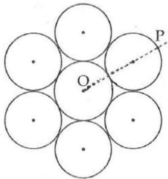 Seven identical circular planar disks, each of mass M and radius R are welded symmetrically as shown. The moment of inertia of the arrangement about the axis normal to the plane and passing through the point P is: